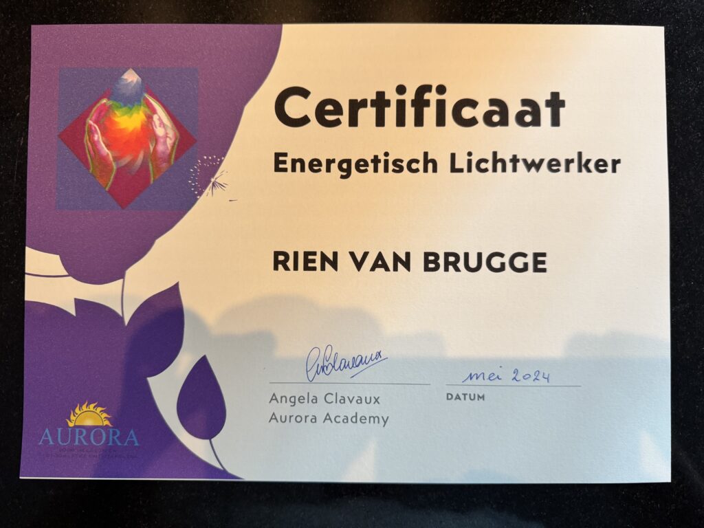 De kern van mijn werk is de verbinding met de Mahatma-energie, ook wel de “energie van de hoogste liefde en eenheid” genoemd. Tijdens mijn opleiding tot energetisch lichtwerker heb ik geleerd om deze krachtige, zuivere energie door te geven, zodat heling op fysiek, mentaal, emotioneel en spiritueel niveau mogelijk wordt. Om het energetisch werk met zorg en diepgang te kunnen doen, heb ik mij de afgelopen jaren steeds verder ontwikkeld en opleidingen gevolgd bij Aurora Academy. Deze certificaten vormen de basis van mijn werk als energetisch lichtwerker met Mahatma-energie